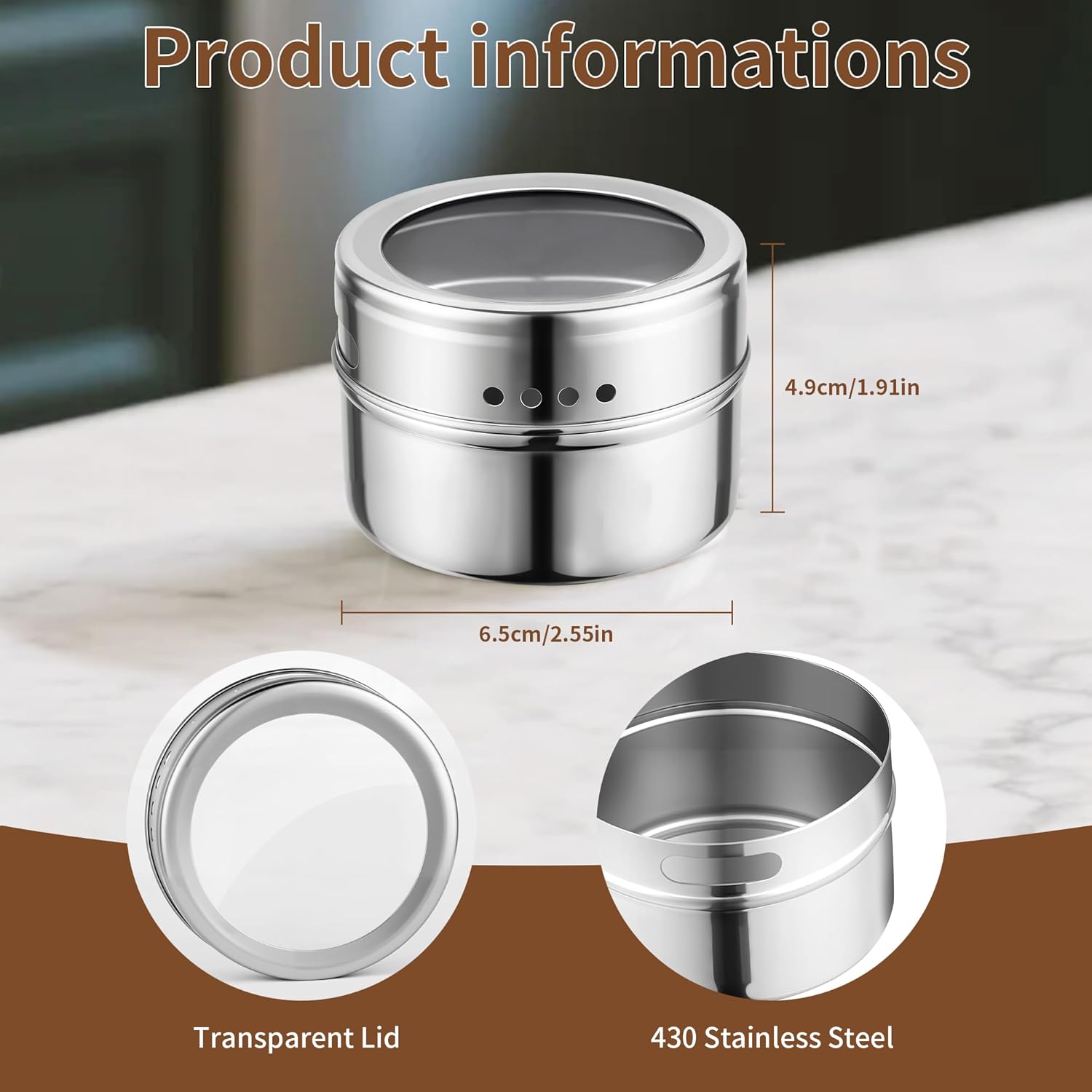 Introducing the luqagol 12pcs Stainless Steel Spice Jars, a sophisticated solution for your kitchen organization needs. These magnetic condiment tins are specially designed with clear lids and dual-hole sift & pour options, offering both convenience and a sleek aesthetic. Made from food-grade stainless steel, these jars are built to last and can be easily attached to any metal surface, making them a perfect addition to any modern kitchen.